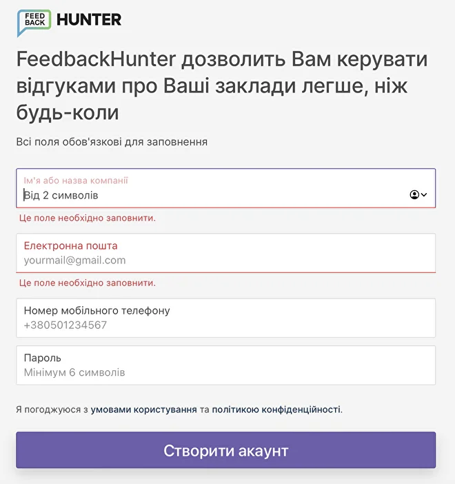 2. Заповніть форму реєстрації: ім'я або назву компанії, електронну пошту, номер телефону, придумайте пароль. Натисніть "Створити акаунт".