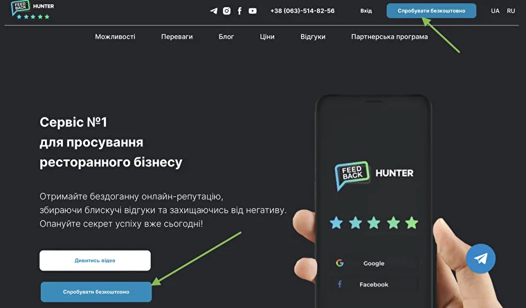 1. На головній сторінці FeedbackHunter натисніть на кнопку "Спробувати безкоштовно"