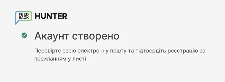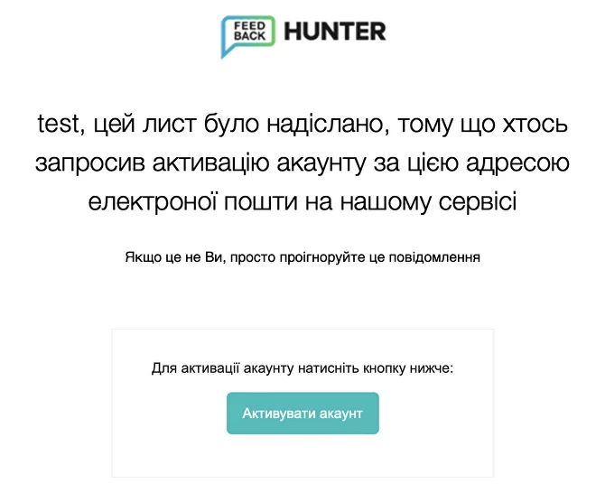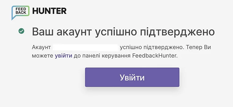 3. Натисніть на кнопку "Активувати акаунт", після цього з'явиться повідомлення про успішну активацію акаунта. Для входу в панель управління FeedbackHunter натисніть кнопку "Увійти".